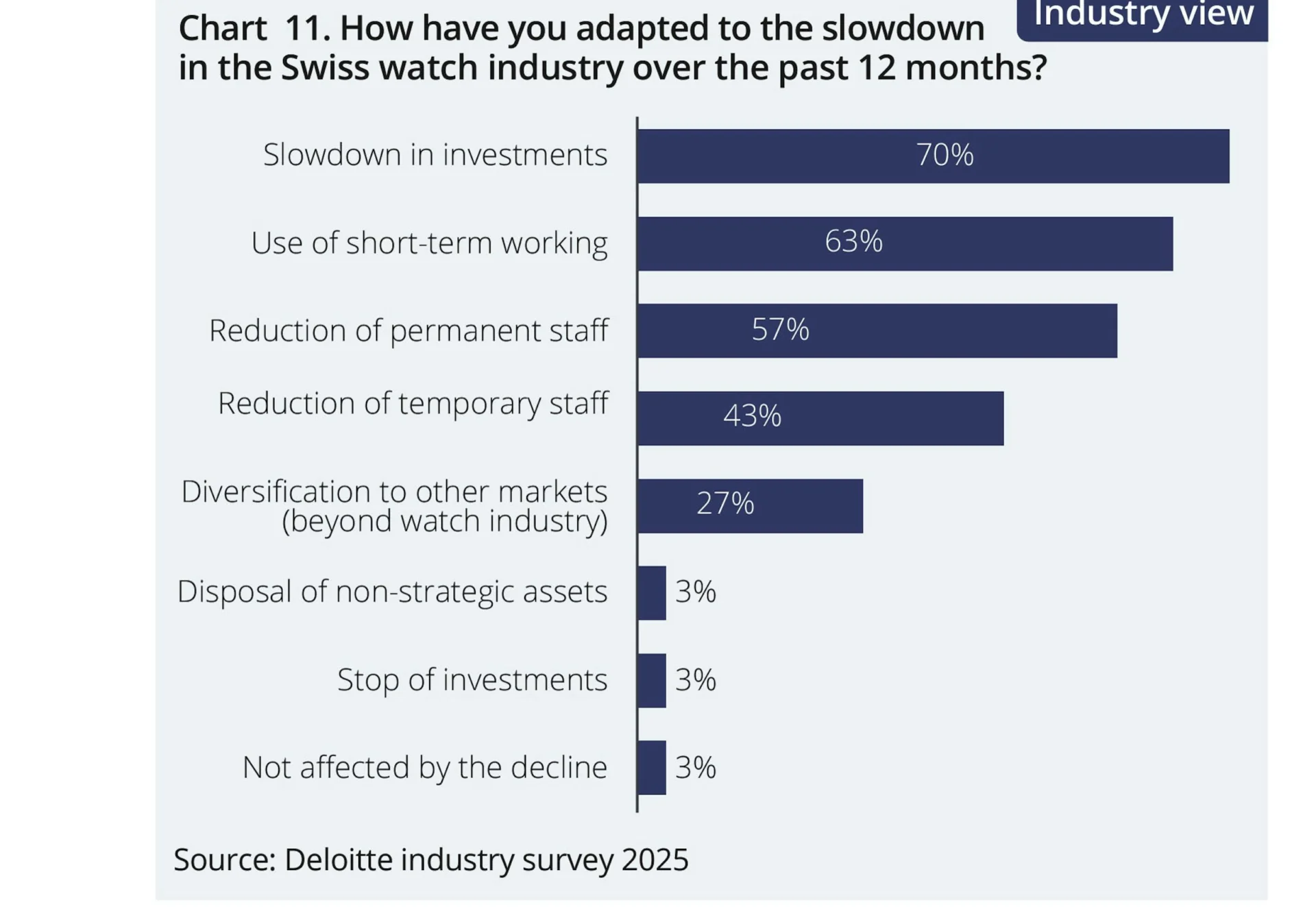 Watchmakers and brands are also adapting and reacting. The survey shows that 70% of industry respondents have slowed investment in the past twelve months and that 63% have used short-term work schemes in Switzerland that allow manufacturers to furlough workers while avoiding full-time layoffs.