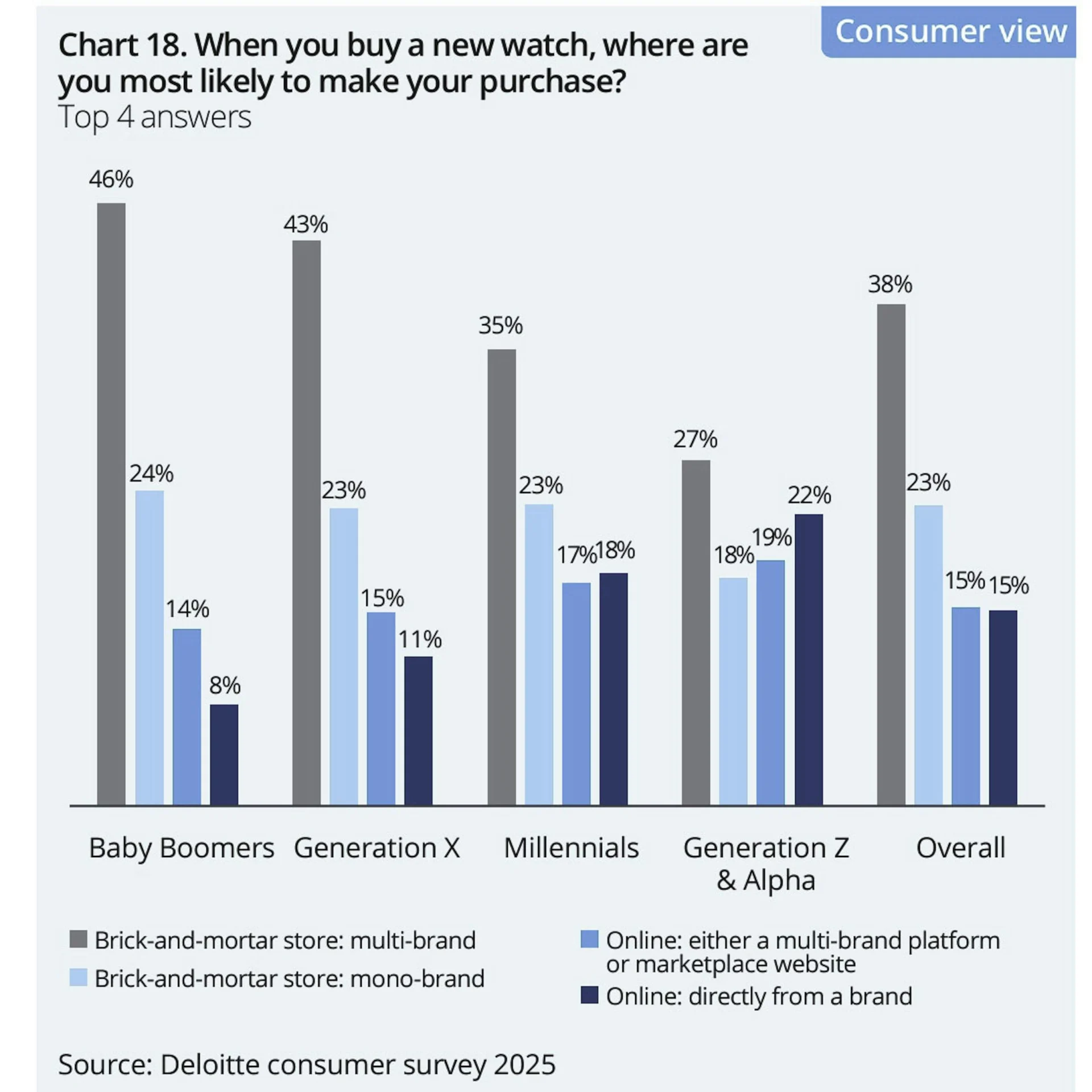 The report shows that consumers also continue to prefer in-person experiences when buying watches. More than 60% of watch buyers say they are most likely to buy a watch in a brick-and-mortar store. And the survey suggests that consumers prefer multibrand stores to mono-brand stores, with 38% of consumer respondents saying a multibrand store is their top choice, while 23% say mono-brand stores are preferable.
