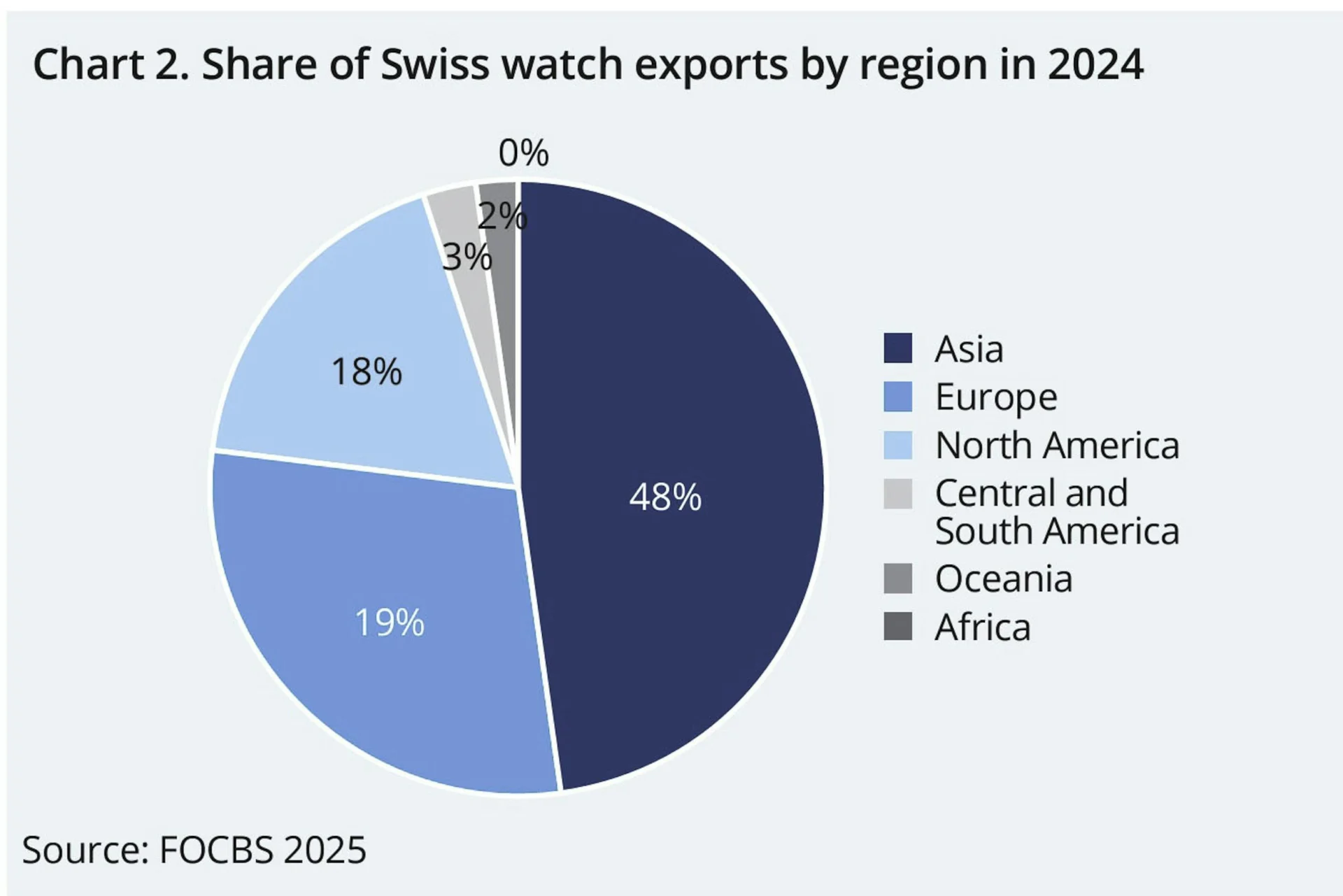 The report also suggests that many industry players, particularly components suppliers, are under significant pressure because of the downturn in demand in some markets, particularly in China, where Swiss watch exports have dropped significantly. But the biggest concern is the current 39% tariff on imported goods from Switzerland to the U.S. that has upended the Swiss watchmaking sector.