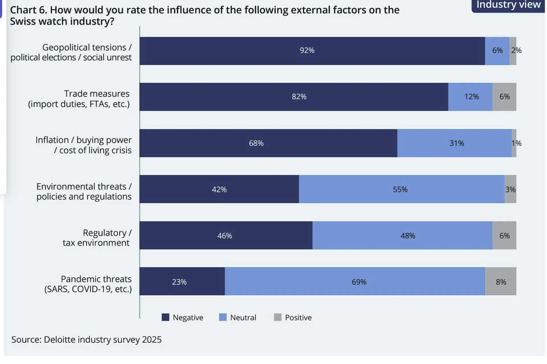 The Swiss watch industry is facing significant challenges from geopolitics, trade barriers, and inflation, with components makers suffering most, a Deloitte study shows.