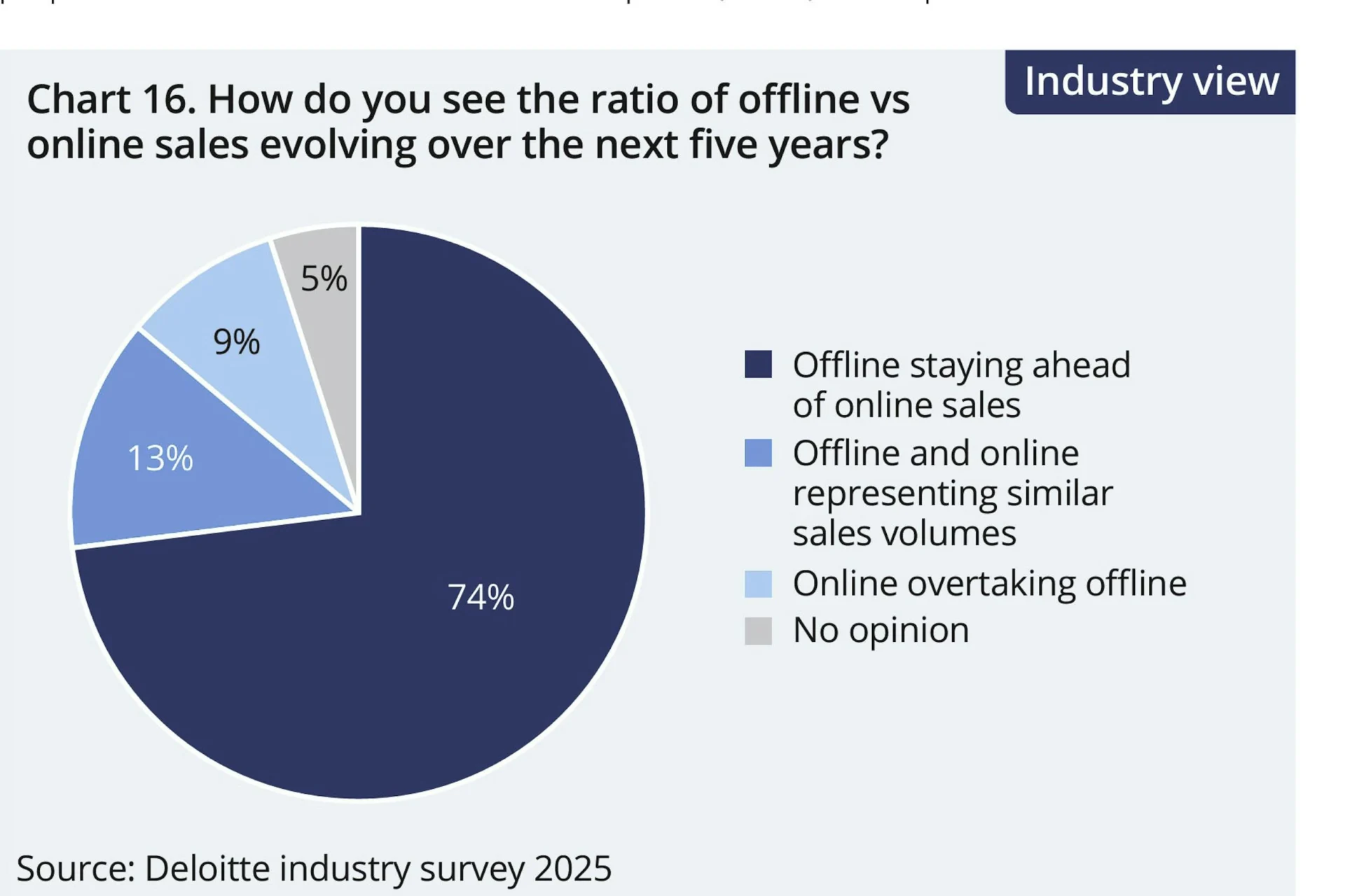 About two-thirds of brands and retailers surveyed by Deloitte said they sell less than 10% of their watches online compared to in stores and don’t expect that to grow significantly in the near future. Almost three-quarters (74%) of industry executives expect offline sales to continue to dominate in the next five years. That marks a notable shift from 2023, when 62% expected brick-and-mortar sales to remain the dominant sales channel.