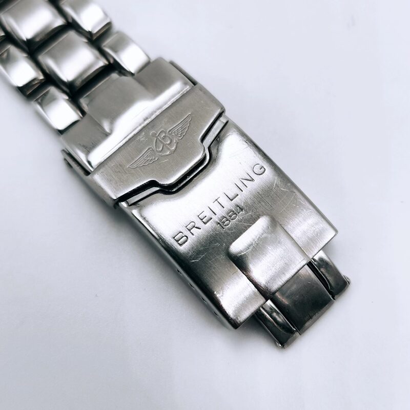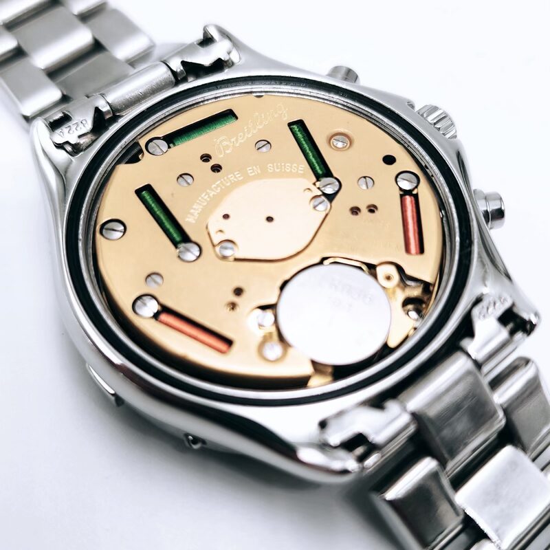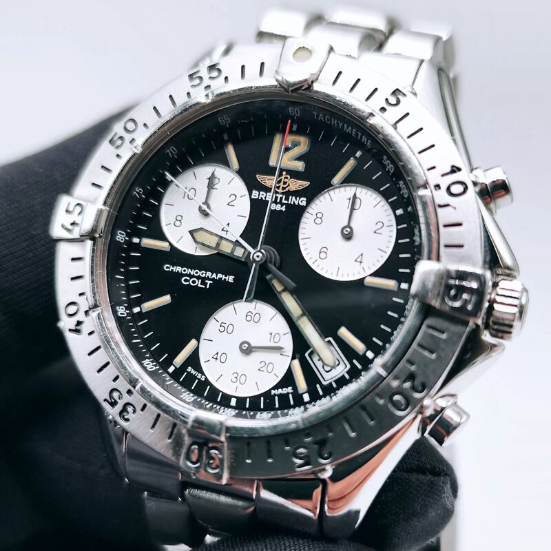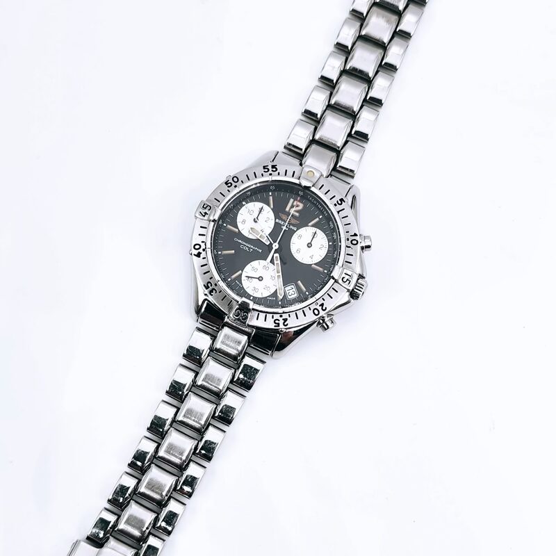 The Breitling Colt Chronograph Ref. A53035 is a robust and highly functional Swiss chronograph, built to meet Breitling’s longstanding reputation for precision and reliability. Produced primarily during the 1990s, this model is a standout example of Breitling’s professional‑grade sports watches. Housed in a 38mm stainless steel case, the watch features a screw‑down crown and pushers, a unidirectional rotating bezel, and a scratch‑resistant sapphire crystal. The dial is designed for maximum legibility, with luminous hands and markers, three chronograph sub‑dials, and a discreet date display positioned between 4 and 5 o’clock. At its core is the Breitling Calibre 53 quartz chronograph movement, offering dependable timekeeping with minimal maintenance. With 100 metres of water resistance, the Colt A53035 is perfectly suited for everyday wear, travel, and active lifestyles, while retaining a clean, timeless aesthetic