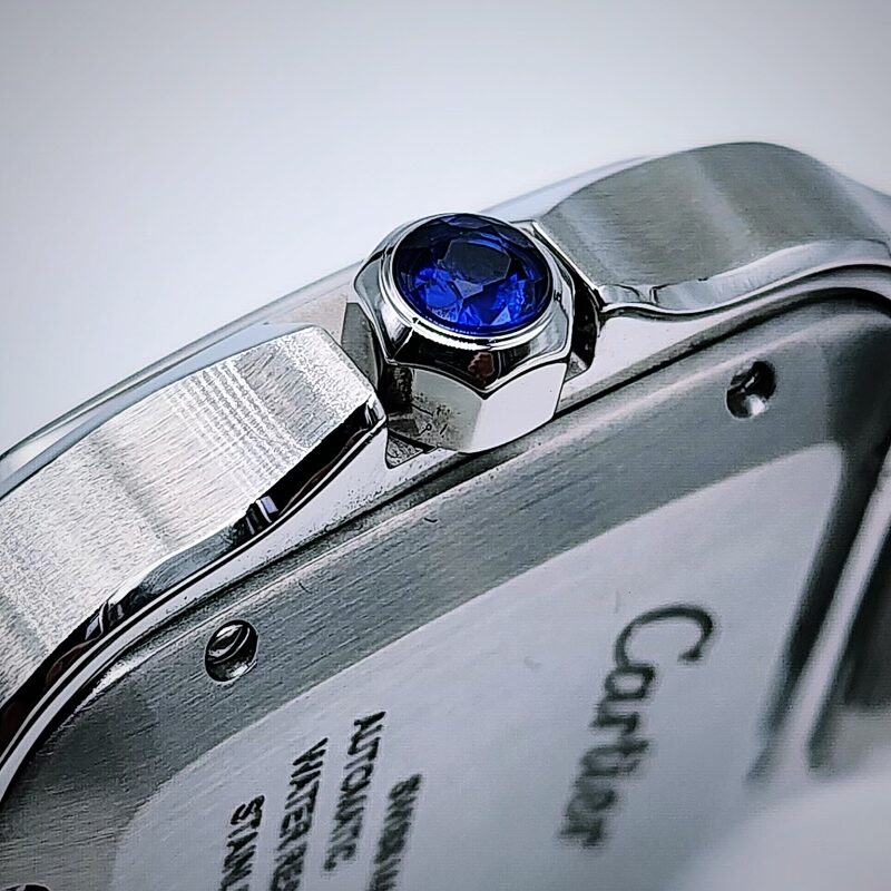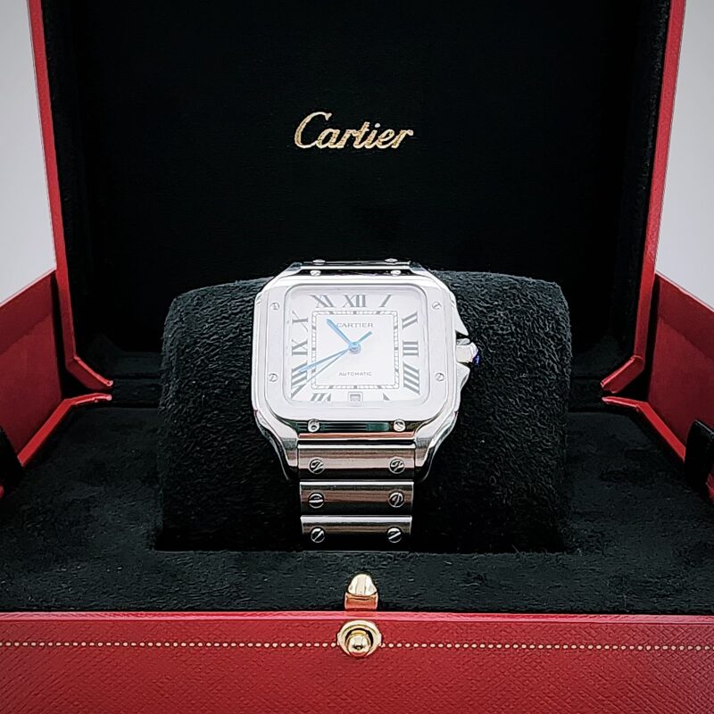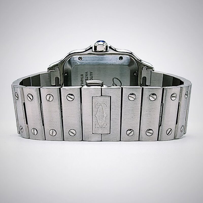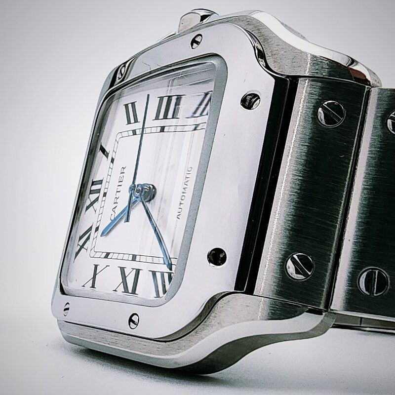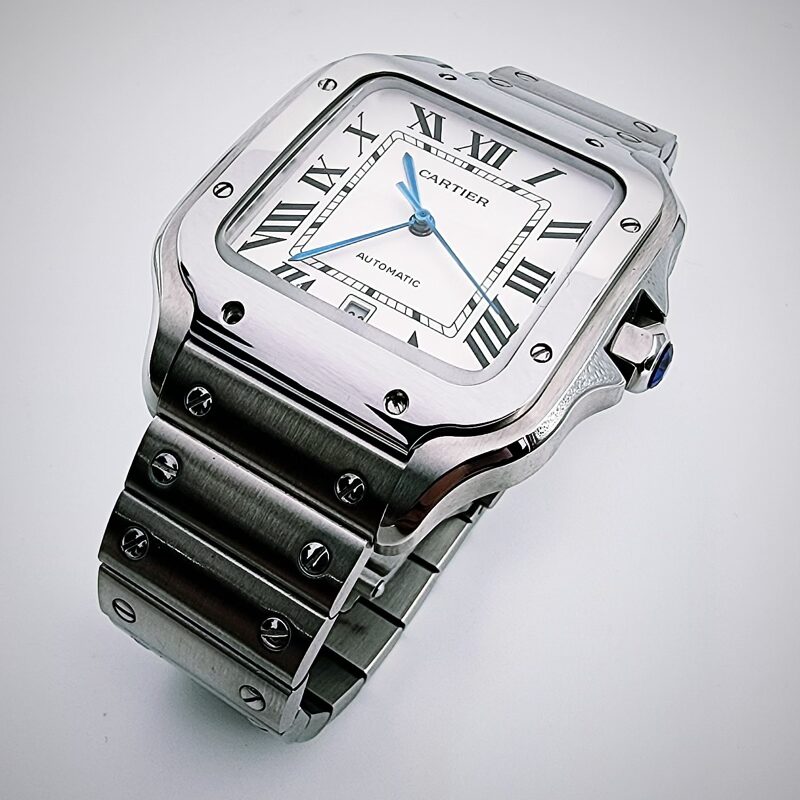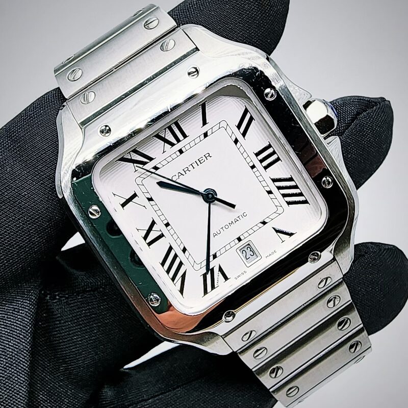 The Cartier Santos de Cartier Large is an automatic mechanical wristwatch powered by the in‑house Cartier calibre 1847 MC, offering standard timekeeping functions of hours, minutes, and central seconds, with a power reserve of approximately 42 hours. The watch features a square case with rounded corners measuring about 39.8 mm in width and approximately 47 mm in length, with a slim profile of around 9 mm, crafted depending on the reference in stainless steel, steel and gold, or titanium. It is fitted with a sapphire crystal, a seven‑sided crown set with a synthetic spinel, and is water‑resistant to 10 bar (100 metres), making it suitable for everyday wear. The dial is typically silvered opaline with Roman numerals, a railway minute track, and sword‑shaped hands, with certain references incorporating luminous material. The Santos Large is supplied with an integrated metal bracelet featuring Cartier’s SmartLink system for tool‑free sizing (steel models) and a secondary strap in leather or rubber, both equipped with the QuickSwitch system that allows easy, tool‑free interchangeability, combining practical functionality with the iconic Santos design heritage.