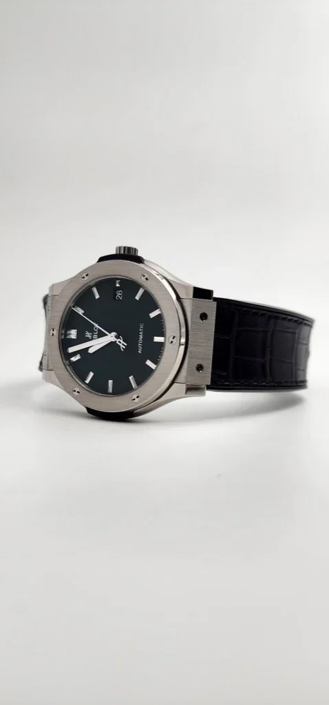 The Hublot Classic Fusion 511.NX.1171.LR is a sophisticated 45mm men’s watch that blends modern elegance with lightweight durability. Crafted from polished and brushed titanium, this timepiece features a fixed titanium bezel secured by six signature “H” screws and a transparent case back. The matte black dial is accented with silver-tone hands and index hour markers, along with a date window at 3 o’clock for added functionality. Powered by the automatic Hublot Calibre HUB1112 movement, it offers a 42-hour power reserve and is protected by a scratch-resistant sapphire crystal. The watch is paired with a luxurious black alligator leather strap and is water-resistant up to 50 meters, making it both stylish and practical for everyday wear