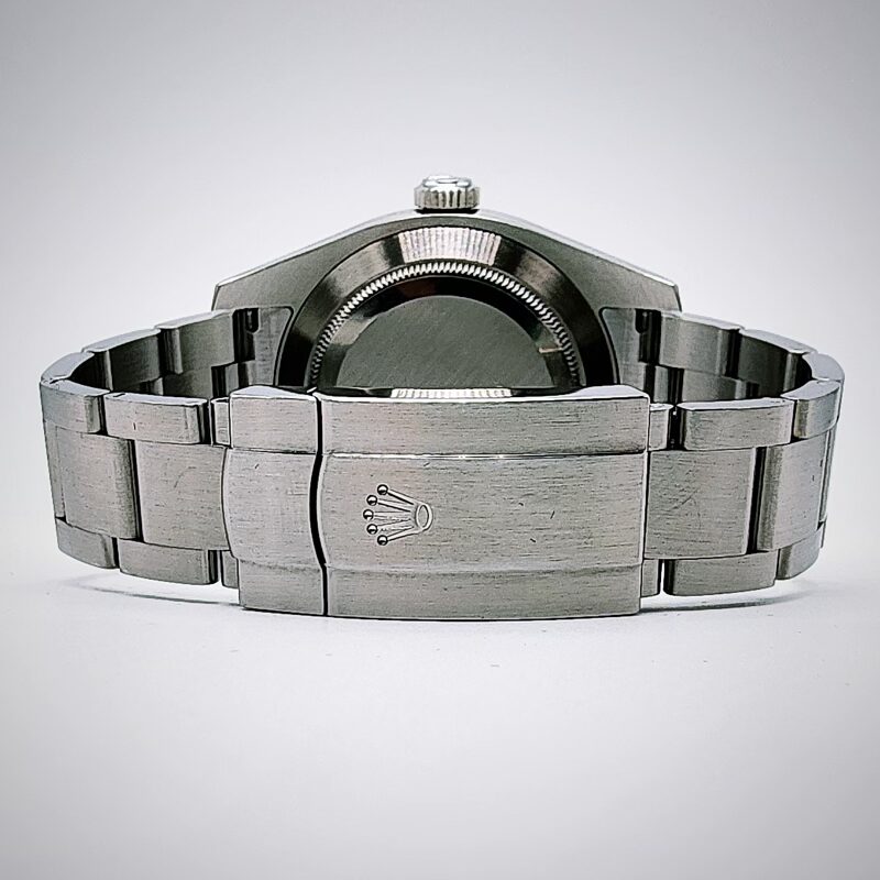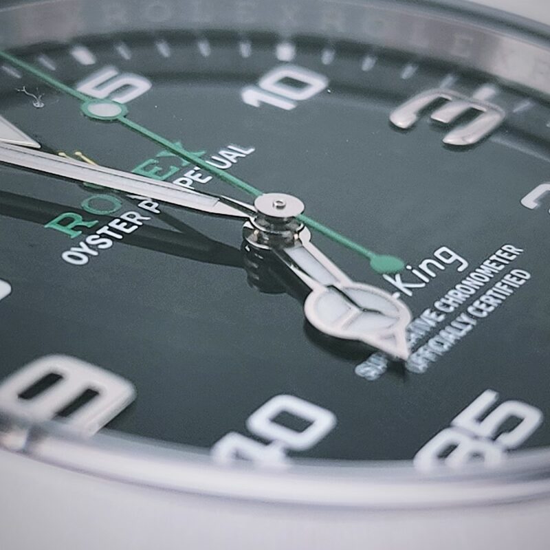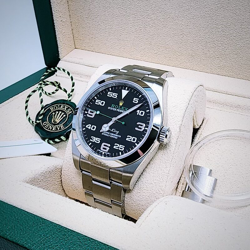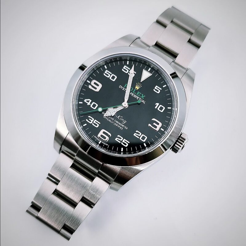 The Rolex Oyster Perpetual Air‑King reference 126900 is a modern aviation‑inspired sports watch introduced in 2022, housed in a 40 mm Oystersteel case with a smooth fixed bezel, screw‑down crown, and sapphire crystal, and offering water resistance to 100 metres. It is powered by the Rolex manufacture calibre 3230, a self‑winding mechanical movement featuring central hours, minutes, and seconds, stop‑seconds for precise time setting, a paramagnetic blue Parachrom hairspring, Paraflex shock absorbers, and an extended power reserve of approximately 70 hours, and is certified as a Superlative Chronometer to Rolex’s −2/+2 seconds per day standard after casing. The black dial is designed for maximum legibility, combining large 3, 6, and 9 Arabic hour numerals with a prominent minute scale, and is equipped with a Chromalight display that emits long‑lasting blue luminescence in low‑light conditions. The watch is fitted with a solid‑link Oyster bracelet in Oystersteel, secured by an Oysterlock folding safety clasp with Rolex’s Easylink comfort extension system, allowing the bracelet length to be adjusted by approximately 5 mm for improved wearability, reinforcing the Air‑King’s positioning as a robust, time‑only professional watch with strong aviation heritage.