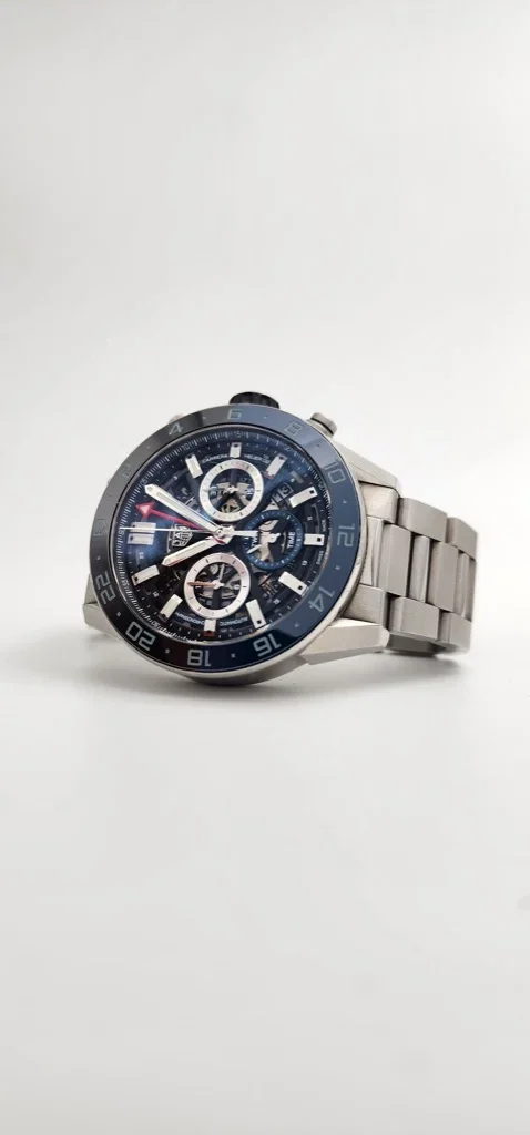 The TAG Heuer Carrera CBG2A1Z.BA0658 is a striking 45mm chronograph designed for international travelers and watch enthusiasts alike. Featuring a robust stainless steel case and a distinctive blue and black ceramic 24-hour bezel, this model is powered by the in-house Calibre HEUER 02 GMT automatic movement, offering an impressive 80-hour power reserve. The open-worked black skeleton dial, visible through both the front and sapphire case back, showcases three chronograph sub-dials and a red lacquered GMT hand for tracking a second time zone. With water resistance up to 100 meters and a fine-brushed steel bracelet, this Carrera blends sporty elegance with advanced functionality for those who demand precision and style.